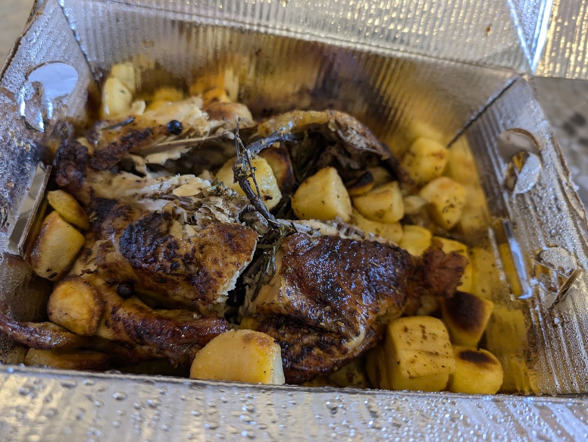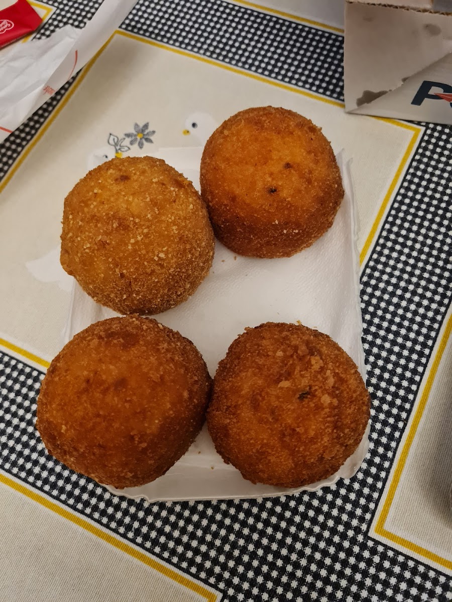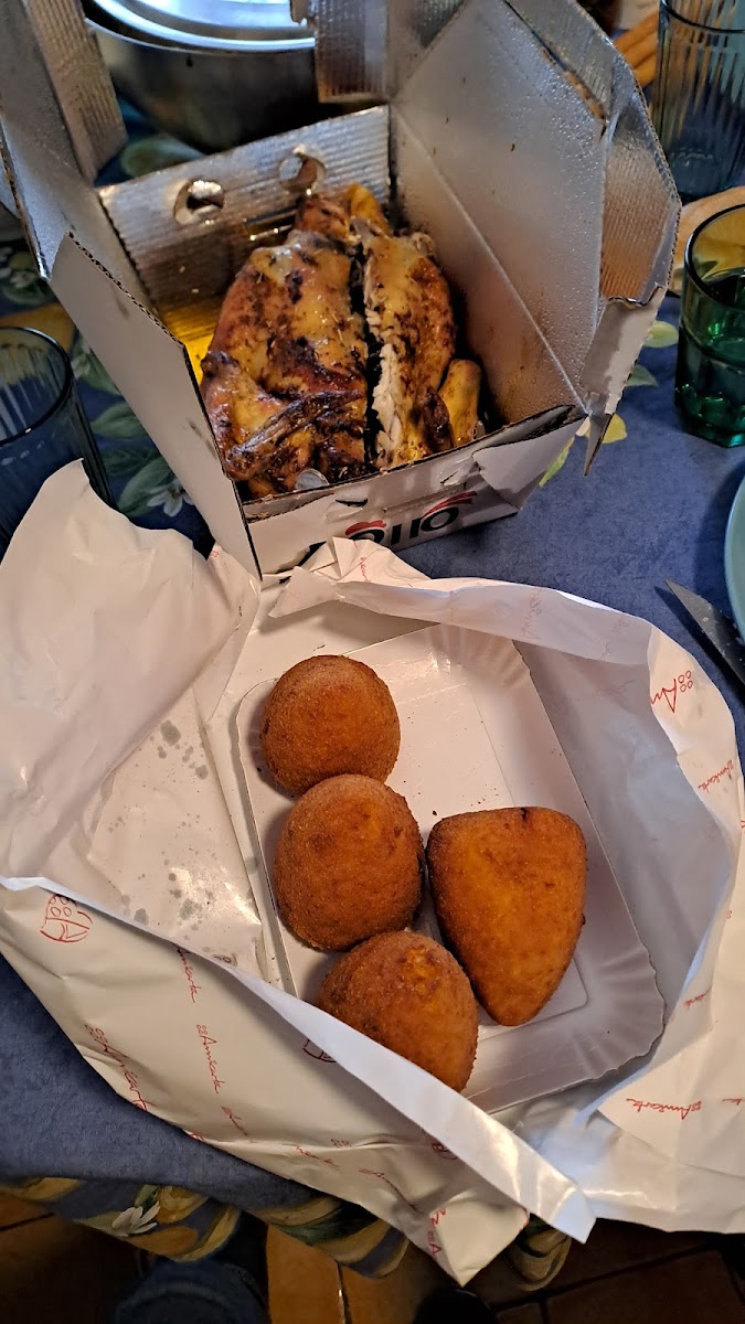 Pollo da dieci. Cuoce lentamente allo spiedo in un forno a legna e prende un gusto ed una croccantezza unici, mantenendosi morbido e succulento al suo interno. Irrorato da un intingolo di erbe, spezie e olio, mangiare questo pollo arrosto diventa un'esperienza per il palato. Gli arancini? Abbiamo preso quelli al ragù che sono veramente eccezionali: delicati, fritti alla perfezione sul momento e con un ripieno squisito. Le patate novelle sono anch'esse una prelibatezza che non vorresti mai finire di mangiare. La qualità dei prodotti e la passione di questa famiglia per il proprio lavoro si riconoscono nell'indiscutibile bontà del cibo. È meglio prenotare il proprio ordine perché le preparazioni sono contate per evitare sprechi e assicurare la qualità (attenzione che la fila è unica, quindi armatevi di pazienza).